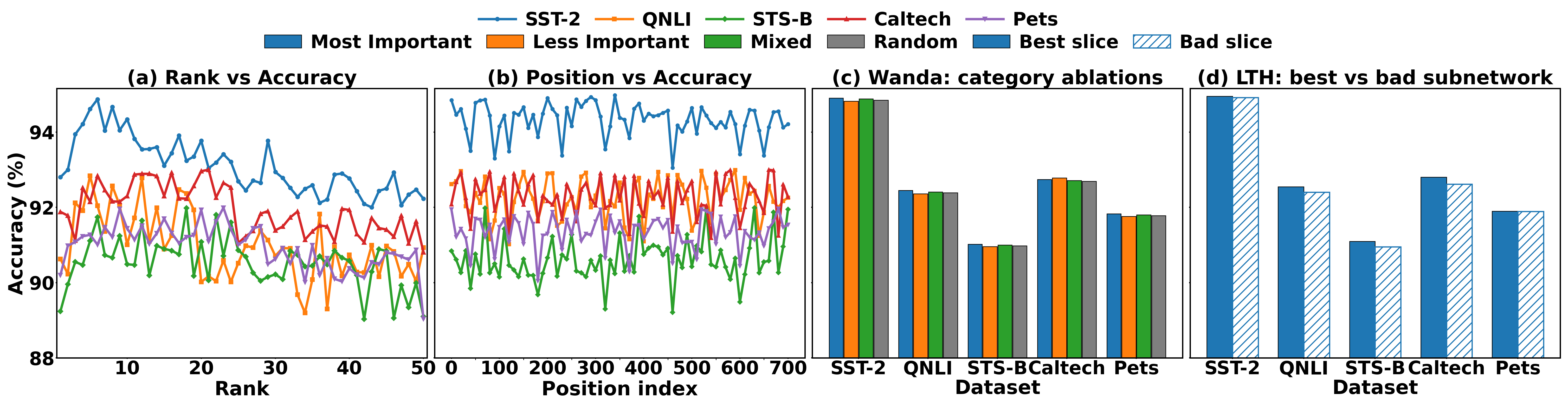 We adopt the Wanda pruning heuristic to rank weights by importance. Given a weight matrix \( W \in \mathbb{R}^{d_\ell \times d_{\ell-1}} \) and activations \( X \in \mathbb{R}^{s \times d_{\ell-1}} \) from a sequence of length \( s \), Wanda defines the importance of entry \((i,j)\) as \( S_{ij} = |W_{ij}| \cdot \lVert X_{\cdot j} \rVert_2 \), where \( \lVert X_{\cdot j} \rVert_2 \) is the \(\ell_2\) norm of the \(j\)-th input feature across the batch. To score a slice, we aggregate over its entries: \( S_{\text{slice}} = \sum_{(i,j)\in \text{slice}} S_{ij} \). We then select slices from the most-important, least-important, mixed, or random categories. Results show nearly identical accuracy across all categories, confirming that slice winners emerge regardless of weight importance.
